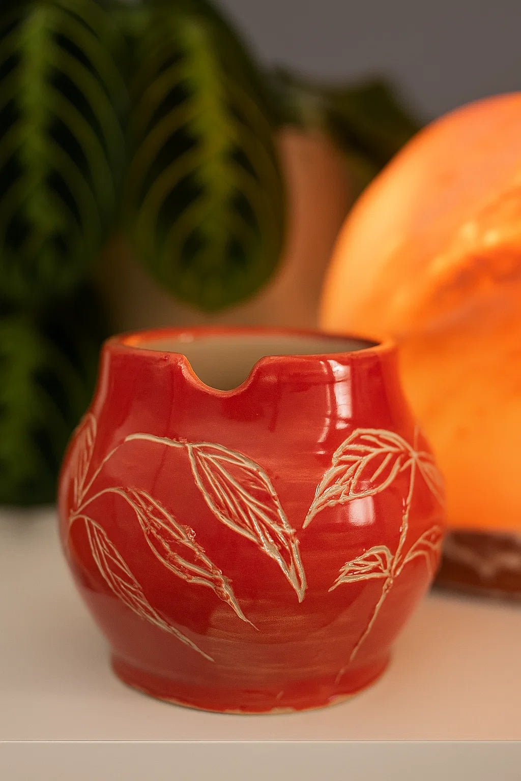 Este matecito, hecho a mano en cerámica, destaca por su diseño elegante en un tono rojo intenso y líneas botánicas talladas a mano que evocan la naturaleza y el bienestar. Su forma redondeada y la hendidura superior lo hacen cómodo, íntimo y perfecto para tus momentos de calma.
