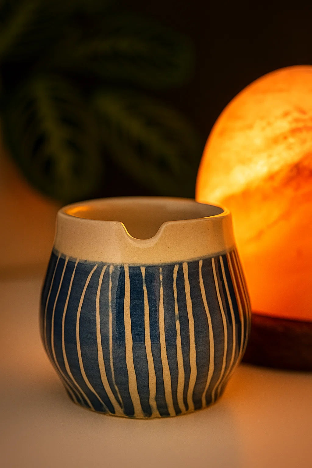 Este matecito, hecho a mano en cerámica, destaca por su diseño irregular con rayas talladas a mano en azul marino. Su forma redondeada y la hendidura superior lo hacen cómodo, íntimo y perfecto para tus momentos de calma.