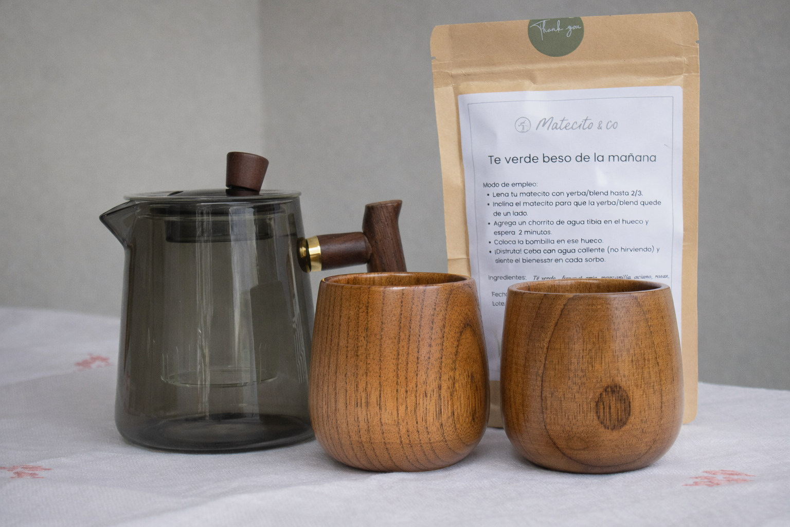 El pack incluye dos tazas de madera, suaves al tacto y perfectas para acompañar el momento, y nuestro blend “Beso de la mañana”, ideal para empezar el día con ligereza y bienestar.
